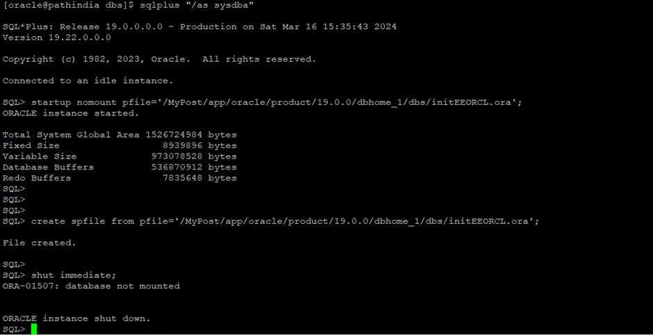 Step-7 Shutdown the database and Start database in nomount state with changed init parameterfile and create spfile using this parameterfile.