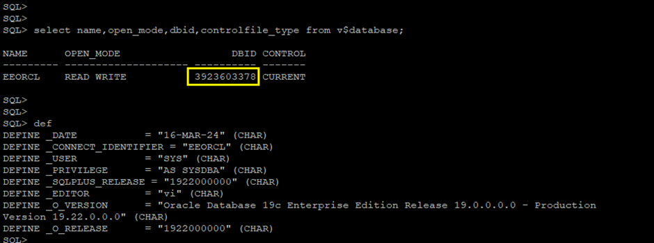 Step-2 First, We checks the DBID of the existing database as below snap.