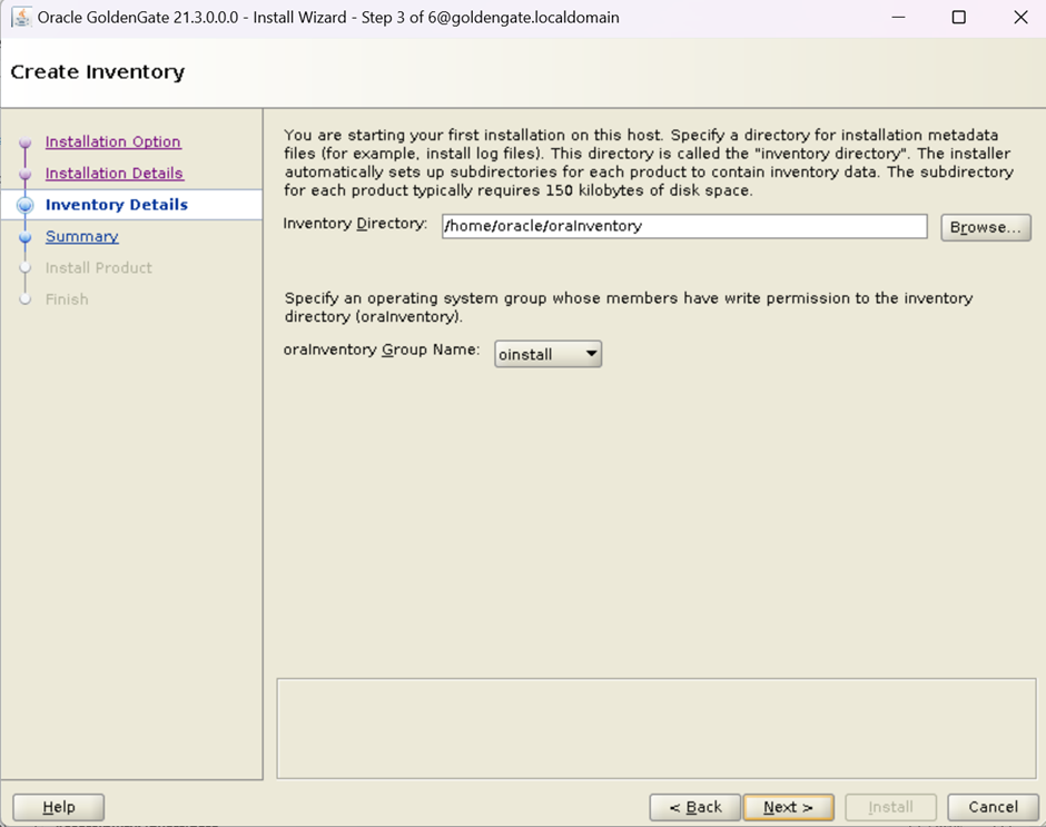 On this screen, provide the Inventory Directory: - You are installing your first installation on this host, Specify a directory for installation metadata files (for example Installation log files) This directory is called "Inventory Directory"