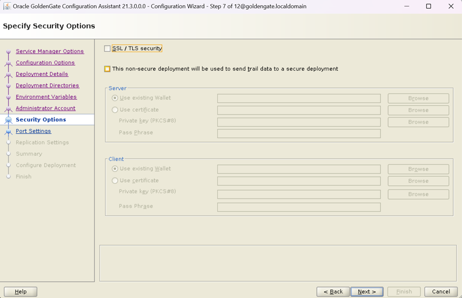 On this screen:-Uncheck the boxes to create unsecured deployment. But, if you are going to replicat data from this unsecured deployment to a secured deployment, then you need to check the second check box. All three cases are shown below, you can select it accordingly.