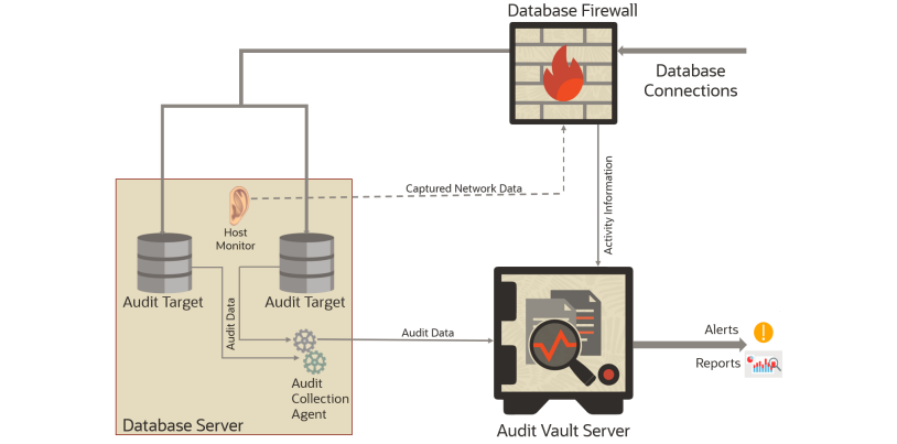 Oracle Audit Vault and Database Firewall consolidates data from audit targets including Oracle and non-Oracle databases, operating systems, directories, file systems, as well as application specific audit data. This data is collected from audit targets and loaded into the audit repository, an Oracle Database which resides on the audit vault server.